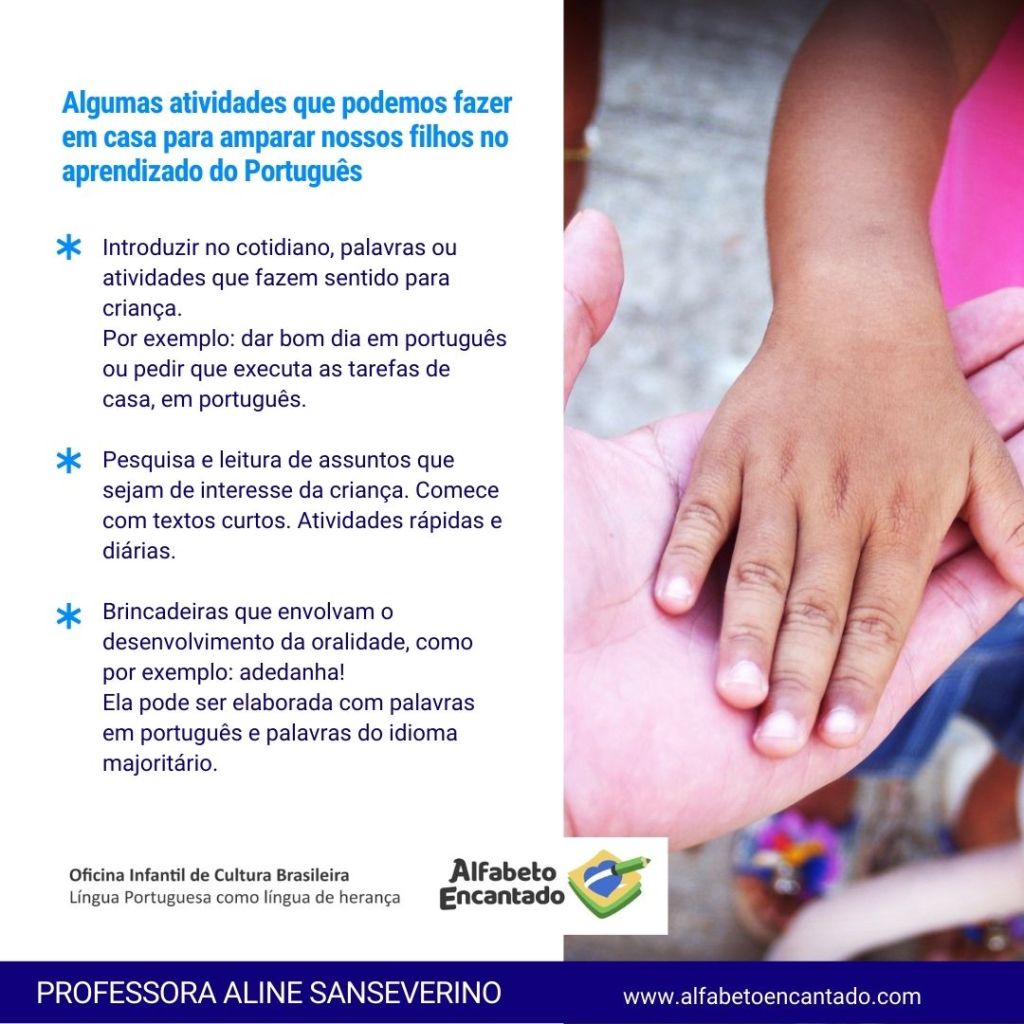 Para isso, listei acima algumas sugestões de como é possível introduzir o português de forma simples, natural e principalmente, de forma prazerosa aos envolvidos. Mesmo que a criança não entenda aquilo que é falado em português, não existe nenhum problema em traduzir para ela e não se esquecer do trabalho de repetição que é importante. Ou seja, uma vez por semana, se vocês escolheram fazer uma lista de supermercados juntos, repita essa ação semanalmente para reforçar o vocabulário apreendido anteriormente. Lembrando que tudo que envolve o novo, pois para eles o português será algo novo, deve ser feito de forma alegre e simples. Não se pode ser encarado como obrigação.